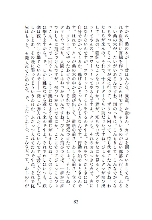 地域の山や猟の話、クマ撃ちの体験談、イワナ・ナマズ等の魚捕り、狐火の話などを、語り口調のまま収録しています。